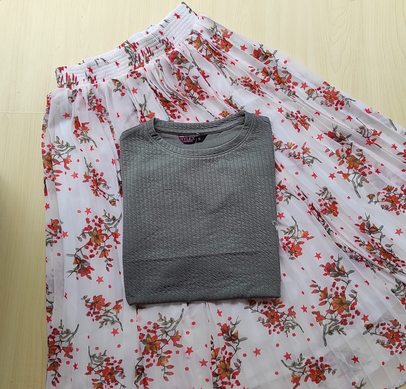 Solid tshirt and pleated skirt Combo
