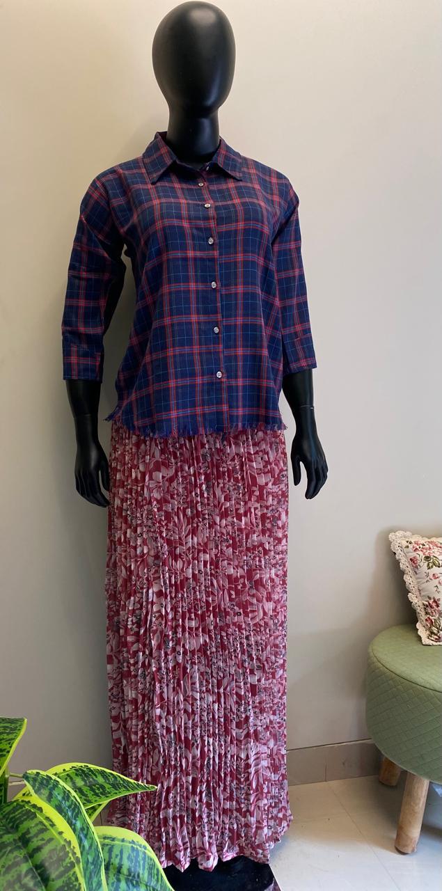 Full length pleated skirt with matching shirt gives a stylish and trendy look